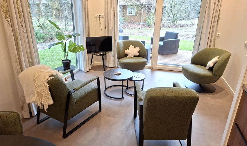 Onze 4 persoonsbungalow Middagten is een oudere bungalow maar door zijn bijzondere ronde vorm nog zeker de moeite waard. Ook omdat hij dit jaar een heel ander interieur heeft gekregen en er een echte boom in de woonkamer staat. Er zijn openslaande deuren in de woonkamer en een open keuken met combimagnetron. Er zijn drie slaapkamers, twee met 1 los boxsprinbed en één slaapkamer met een tweepersoonsboxspringbed. Allemaal met dekbedden op de bedden en een wastafel op de kamer. Er is een badkamer met wastafel, douche en toilet. Het blijft lekker warm door de centrale verwarming.